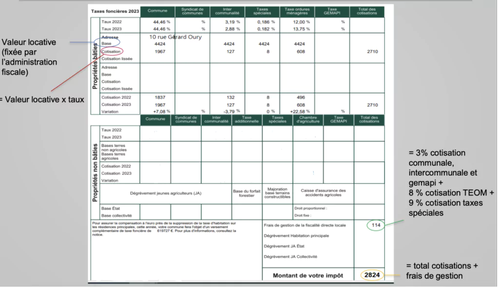 → si le taux global dans une commune est de 100 %, la taxe foncière coûtera théoriquement