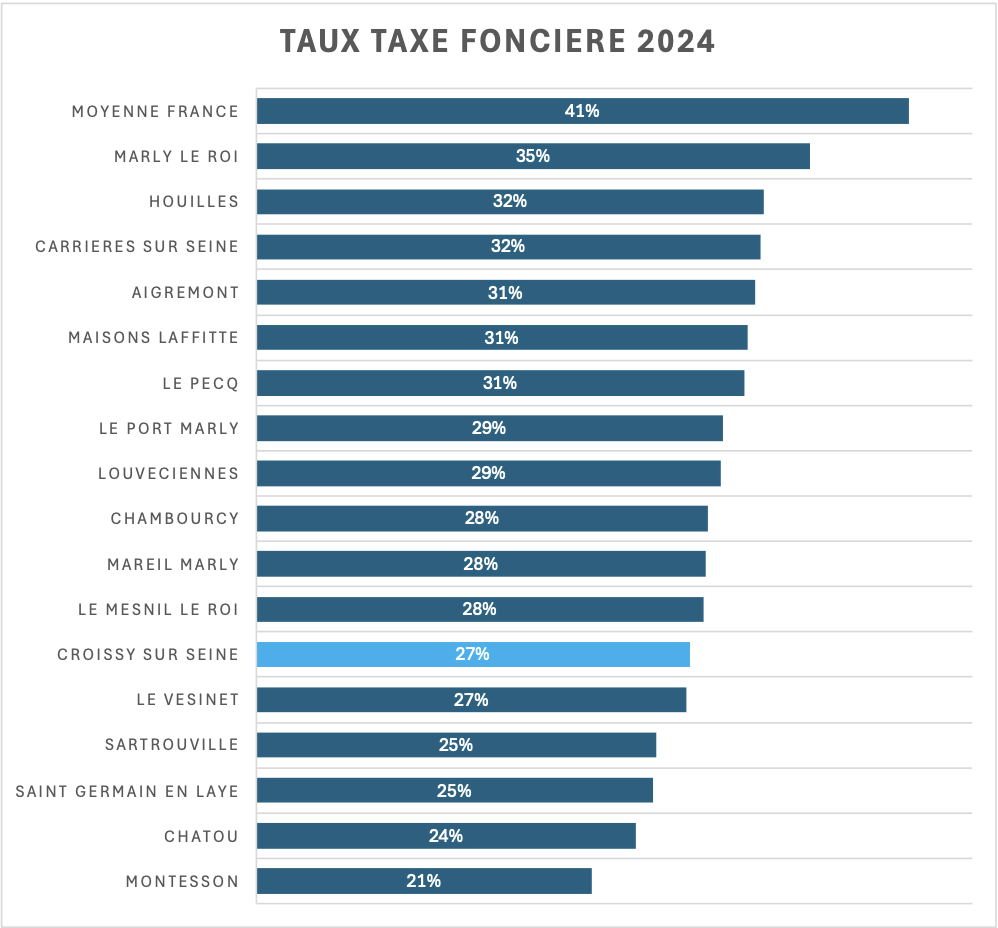 A Croissy en 2024, le taux de la taxe foncière est de 27,2% (en hausse de 22% sur 10